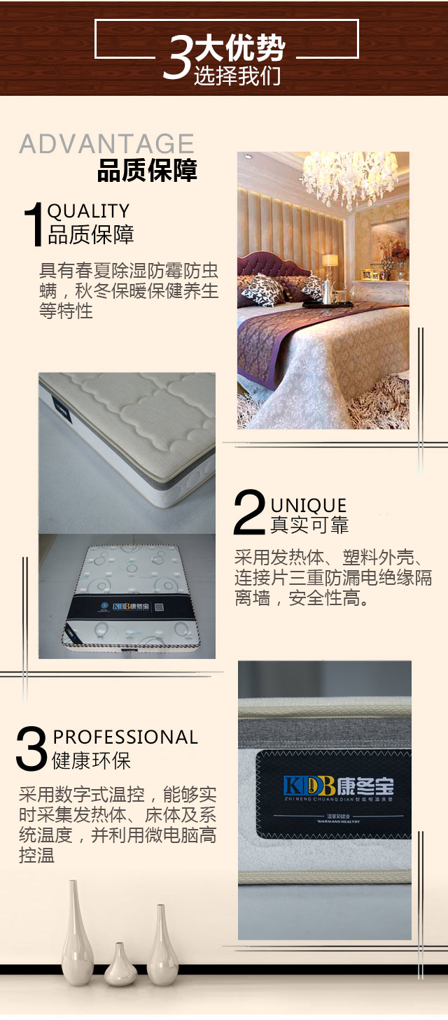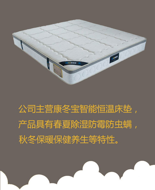 康冬宝家居公司成立于2008年,公司总部位于广东省佛山市顺德区龙江镇龙峰路口,注册资金500万,是集研发、生产、销售和服务于一体的企业。 公司主营康冬宝智能恒温床垫,产品具有春夏除湿防霉防虫螨,秋冬保暖保健养生等特性。康冬宝智能恒温床垫采用数字式温控,能够实时采集发热体、床体及系统温度,并利用微电脑高控温。且考虑到安全问题,康冬宝智能恒温床垫采用发热体、塑料外壳、连接片三重防漏电绝缘隔离墙,从而保证绝缘,杜绝了漏电隐患。 我司秉着:诚信创新,合作共赢的经营理念,现拥有一支高素质的研发、销售和服务团队,建立了健全的质量管理体系,公司坚持把“质量高于一切”贯穿于整个生产、销售和服务中,精心打造健康 保暖 养生系列产品。